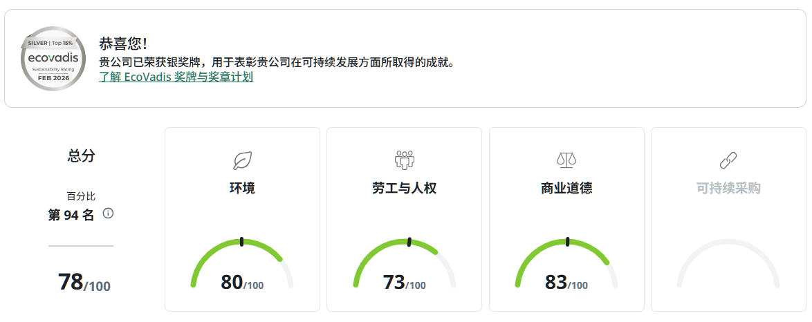 值得关注的是,在本次 Ecovadis 评级申报全流程中,野马技术完全依托自有专业团队,独立完成了全维度数据收集、核心问题深度剖析、申报资料系统梳理与评级报告全流程撰写工作,凭借对 ESG 体系的精准把控与专业能力,实现首次参评即高分斩获银牌,充分彰显了团队过硬的专业素养、全面的体系化服务能力,以及对企业可持续发展战略的深度落地能力。