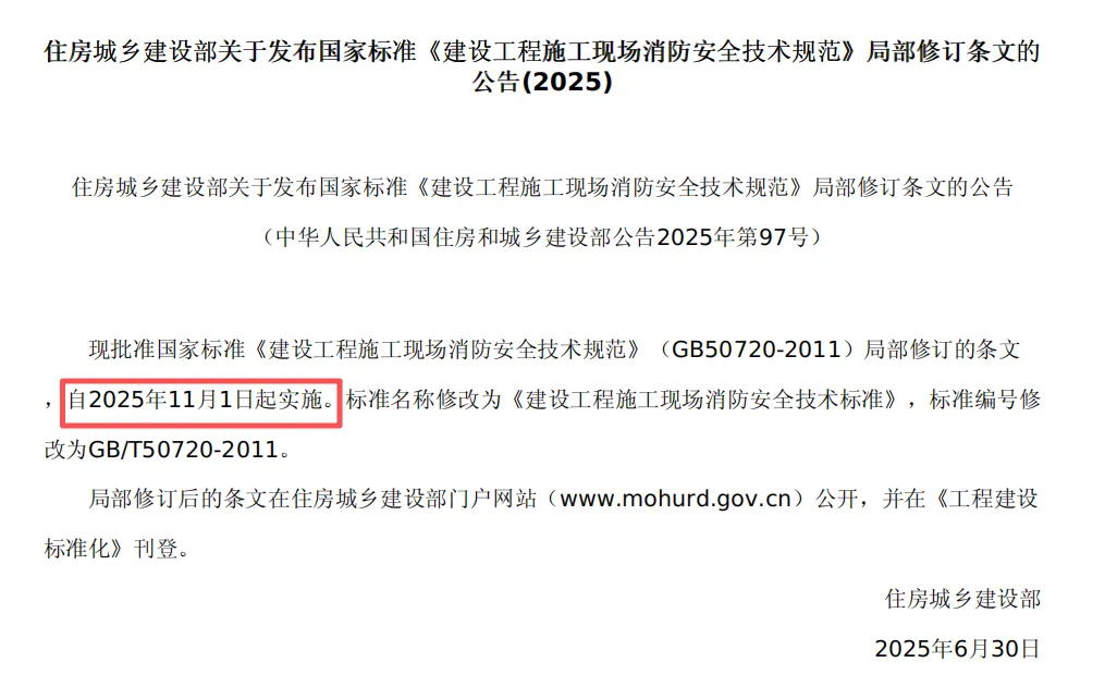住建部 2025 年 6 月 30 日发布公告,对 GB/T 50720—2011 施工现场消防规范进行局部修订,重点针对动火作业、易燃材料、临时设施,该规范也是由 2025 年 11 月 1 日起实施。