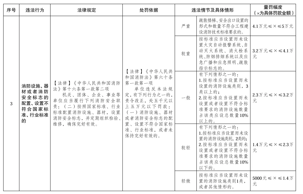 在新实施的《基准》中,第二部分是消防行政处罚裁量基准细则,含违法行为、法律规定、处罚依据、违法情节及具体情形量罚幅度 (×为具体罚款金额)等内容。